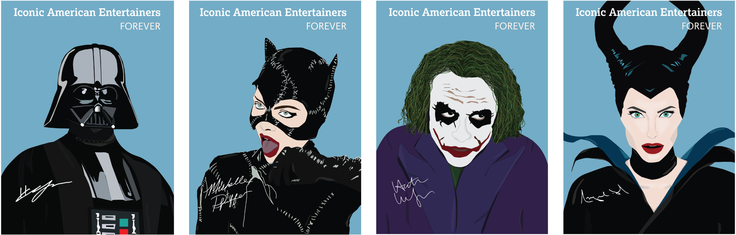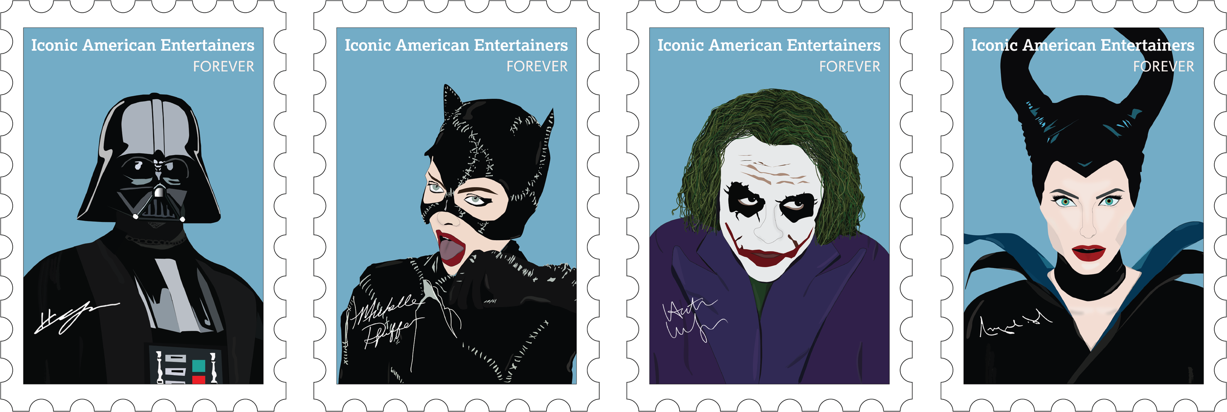 The final designs include intentional typographic choices and personal touches to strengthen the visual narrative. “Iconic American Entertainers” is set in a serif typeface to give the title a classic, commemorative feel, while “forever” appears in a script font reminiscent of traditional postage stamps. To further individualize each piece, I added the actual signatures of each character, introducing a layer of authenticity and recognition. These thoughtful details brought cohesion, character, and a refined finish to the overall series.